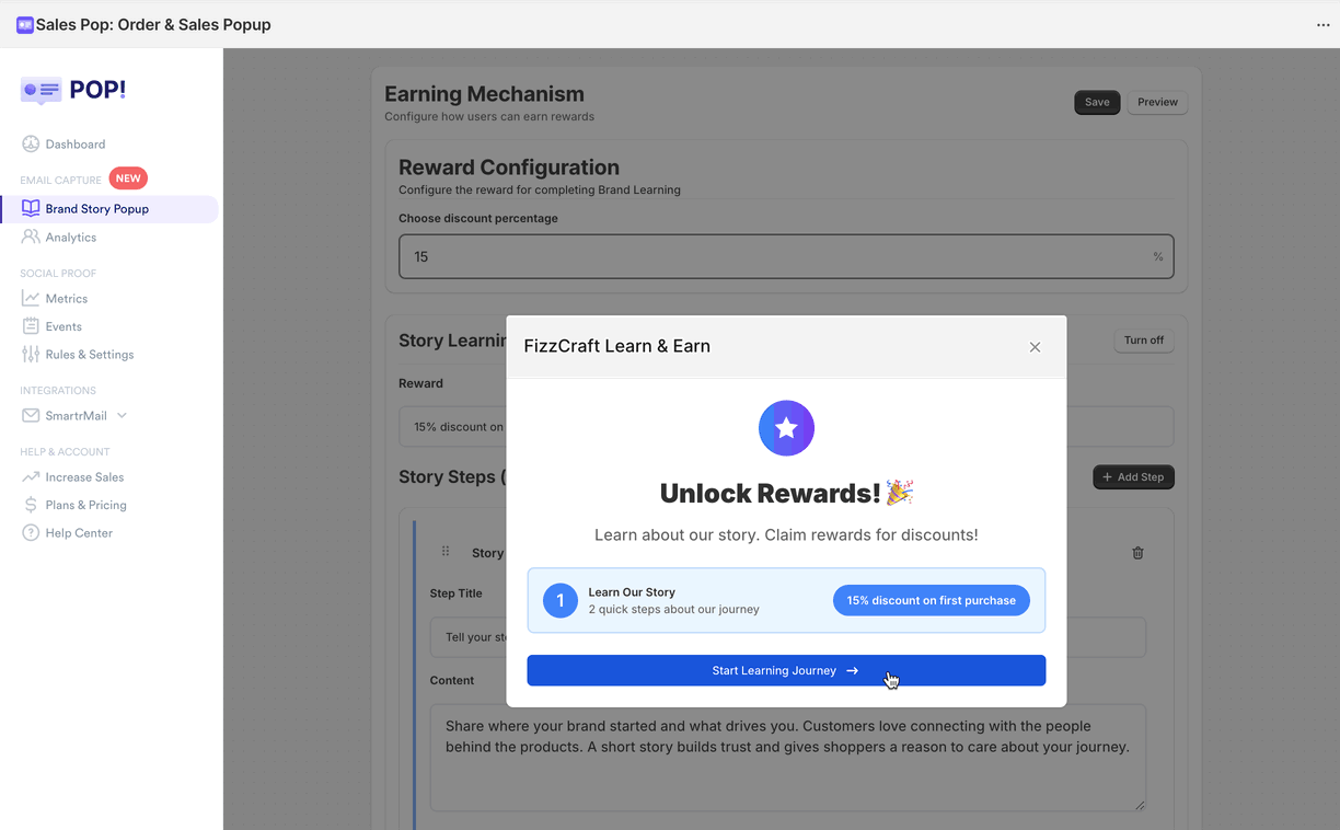 The Brand Story Popup helps you engage shoppers by sharing your brand story before they receive a reward for subscribing. This step-by-step guide explains how to configure the pop-up.