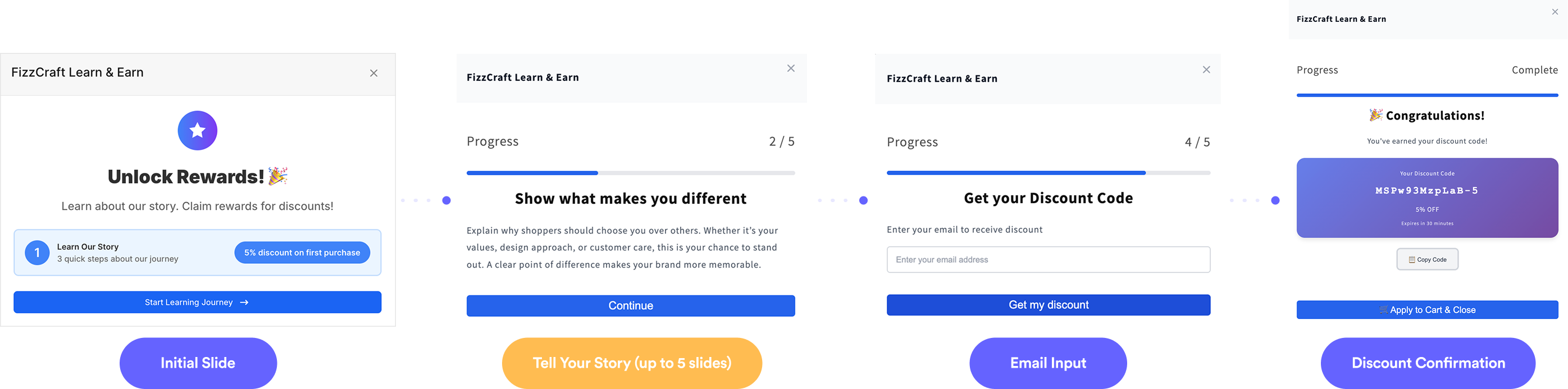 Consider that there are always 3 fixed slides: intro, email input, and discount confirmation. These slides aren’t customizable (yet 😉) but are included in the total count.